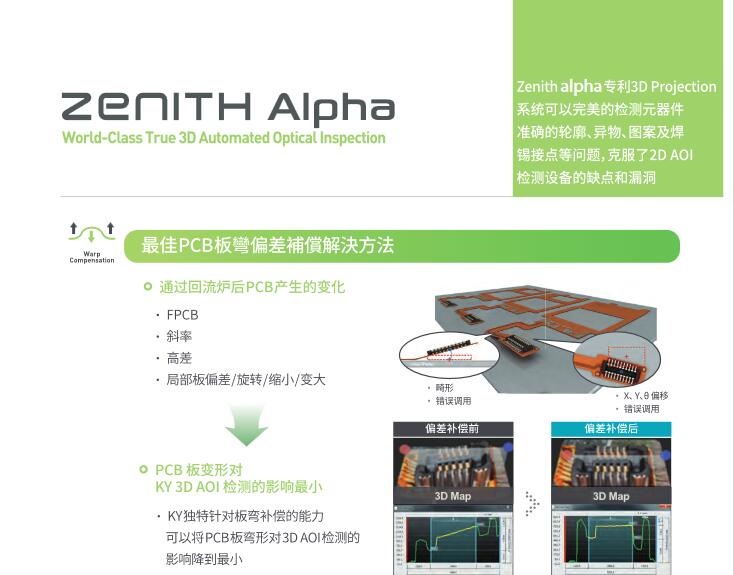 KOH YOUNG Zenith Alpha 3D AOI 利用Koh Young人工智能專利技術提高3D檢測性能 可適用于復雜產線的高速檢測 性價比好的設備 可檢測高元器件(Alpha HS+) 基于人工智能技術的3D幾何自動編程(KAP) KSMART 解決方案:基于全3D檢測的監控系統