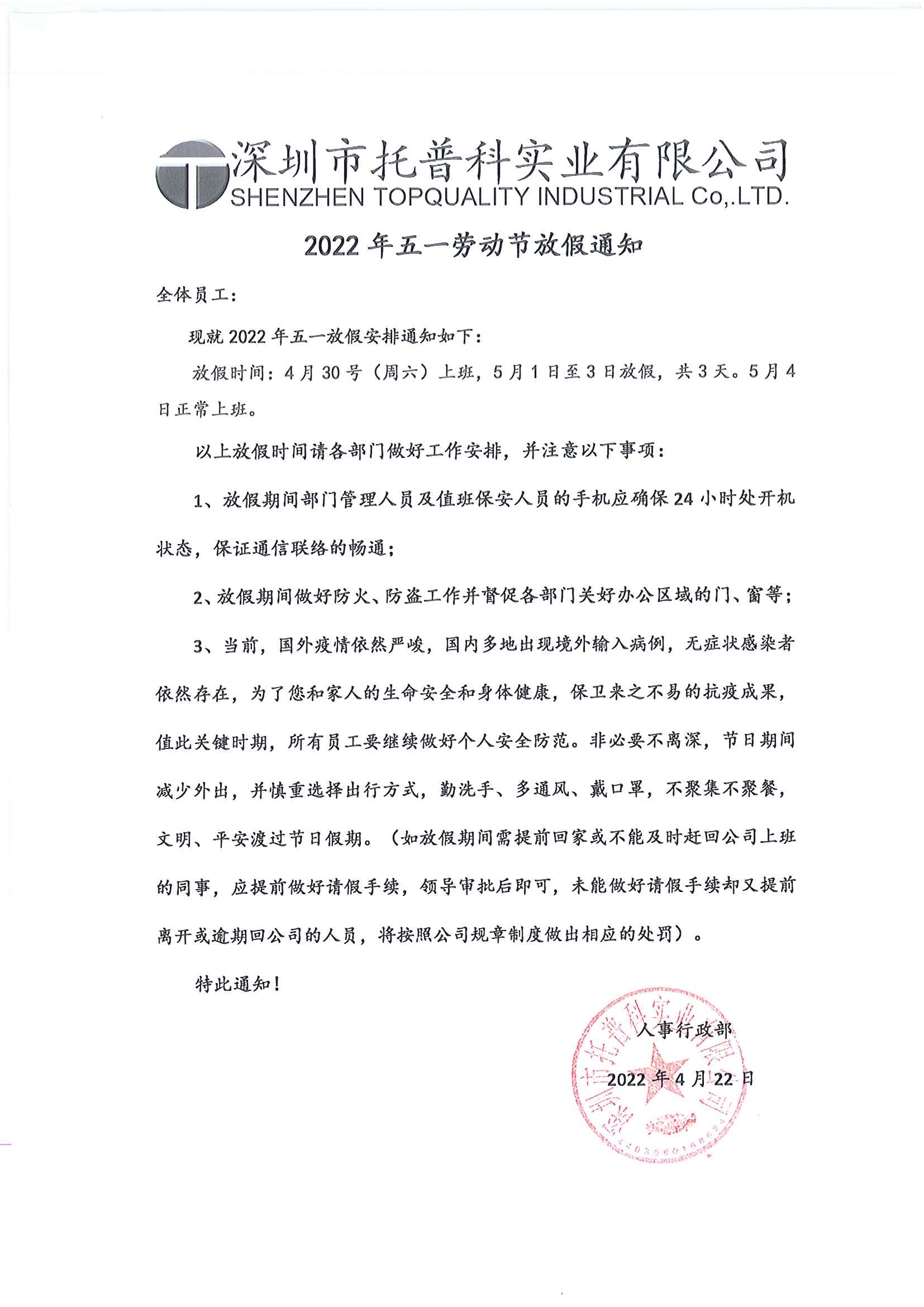 深圳托普科2022年五一勞動節放假公告