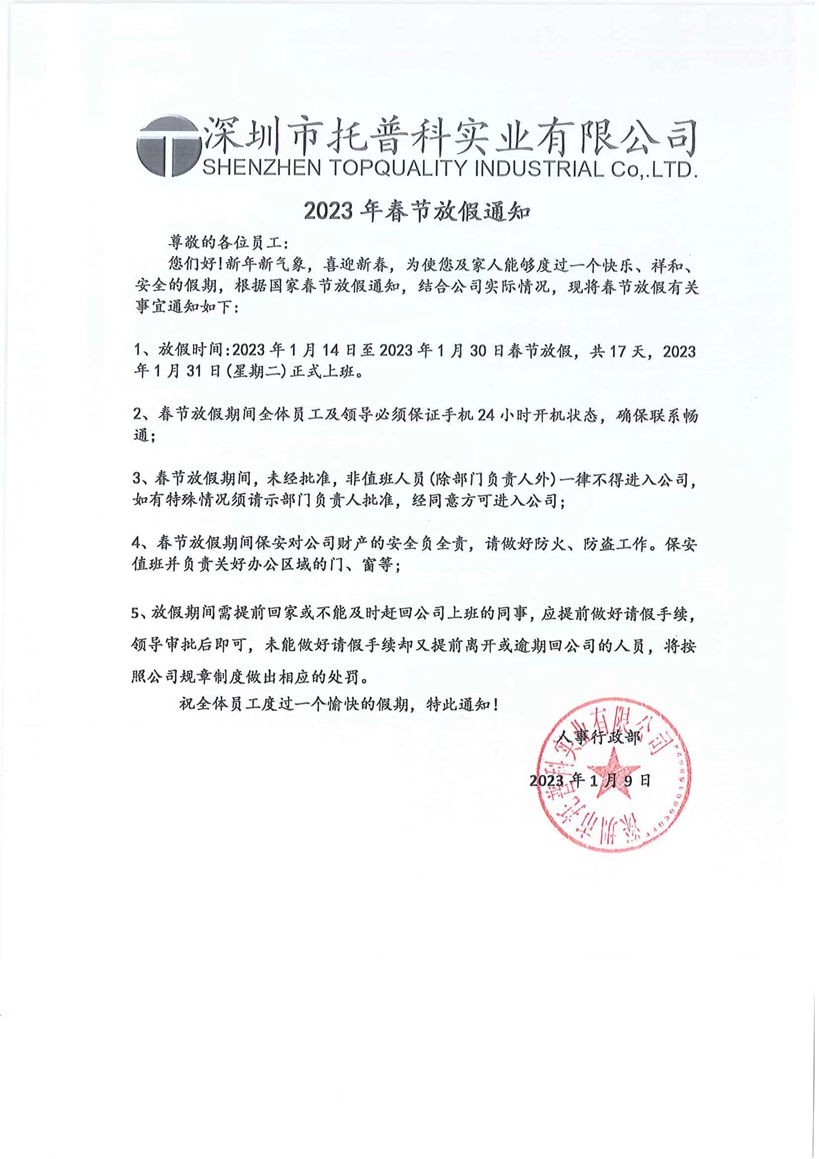 2023年春節即將臨近,根據國家放假通知結合公司實際情況,現將春節放假有關通知公布如下