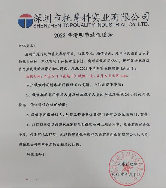 深圳托普科實業2023年清明節放假通知如下
