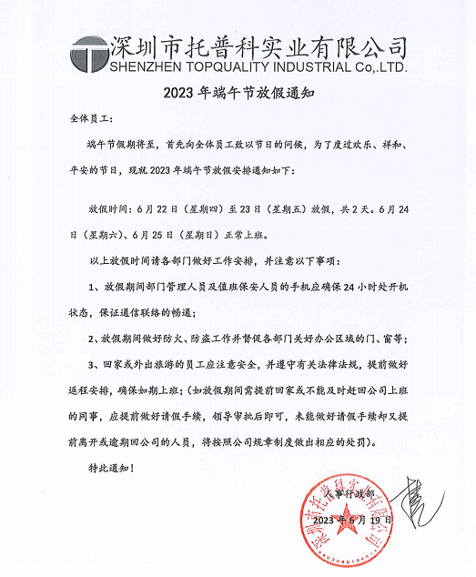 2023年端午節(jié)將至,根據(jù)國務(wù)院放假安排及公司實際情況,現(xiàn)就2023年端午節(jié)放假公告如下: