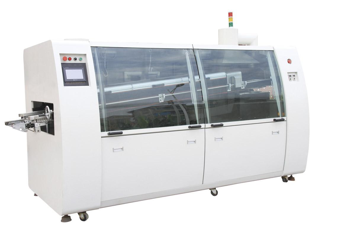 將熔化的軟釬焊料(鉛錫合金),經電動泵或電磁泵噴流成設計要求的焊料波,使預先裝有元器件的印制板通過焊料波,實現元器件焊端或引腳與印制板焊盤間機械與電氣連接的軟釬焊。波峰焊機主要是由運輸帶,助焊劑添加區,預熱區和波錫爐組成其主要材料是焊錫條