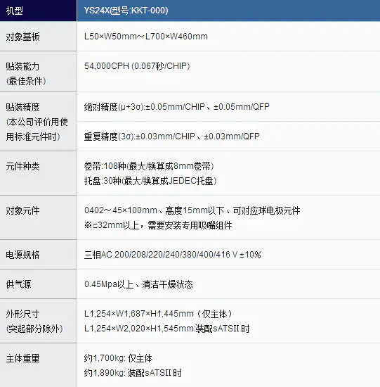 YAMAHA貼片機-YS24X型產品概述: 54,000CPH(0.067 秒/CHIP)通用貼片機最佳的貼裝能力 sATSⅡ自動交換式托盤 對應供給裝置 L700×W460mm 對應超大型基板 對應雅馬哈雙搬運軌道系統(tǒng) 0402~45×100mm 對應元件 H15mm 對應高度